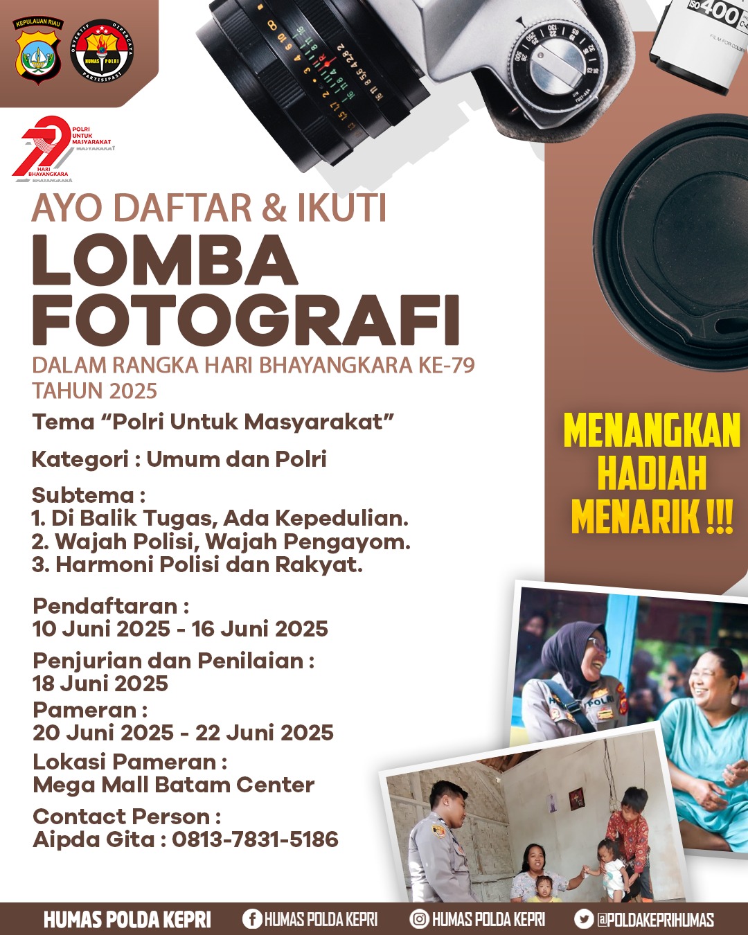 Untuk informasi pendaftaran dan teknis lomba, masyarakat dapat mengakses akun resmi Polda Kepri di Instagram (@humaspoldakepri), Twitter (@poldakeprihumas), Facebook (Humas Polda Kepri), serta situs web tribratanews.polri.go.id.